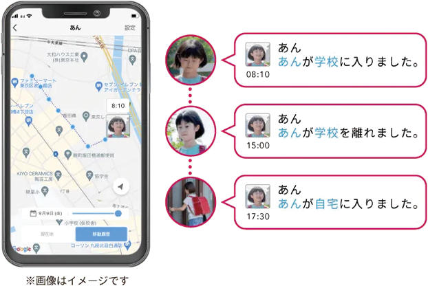 事前に設定したスポットを通過したときや自宅に帰ってきたときの通知機能が搭載されていると、保護者が出迎えられない場合でも、予定通りに出発・到着したかを見守ることができます◎