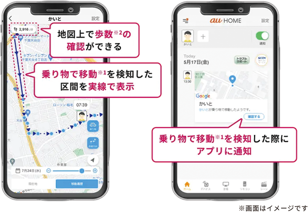 ※1 電車やバスなどに乗っているときの2点間の速度を計算して15km/h以上の場合に通知 ※2 身長から計算した歩数を表示