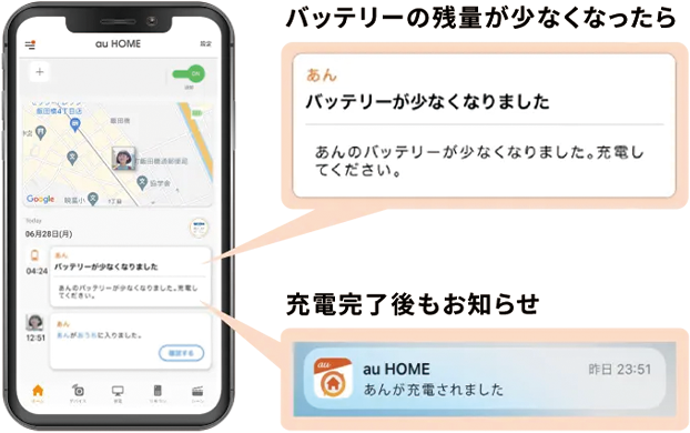 さらに、バッテリーの残量が少なくなったときや充電が完了したときには通知が届くので、ランドセルや鞄に入れっぱなしでも◎